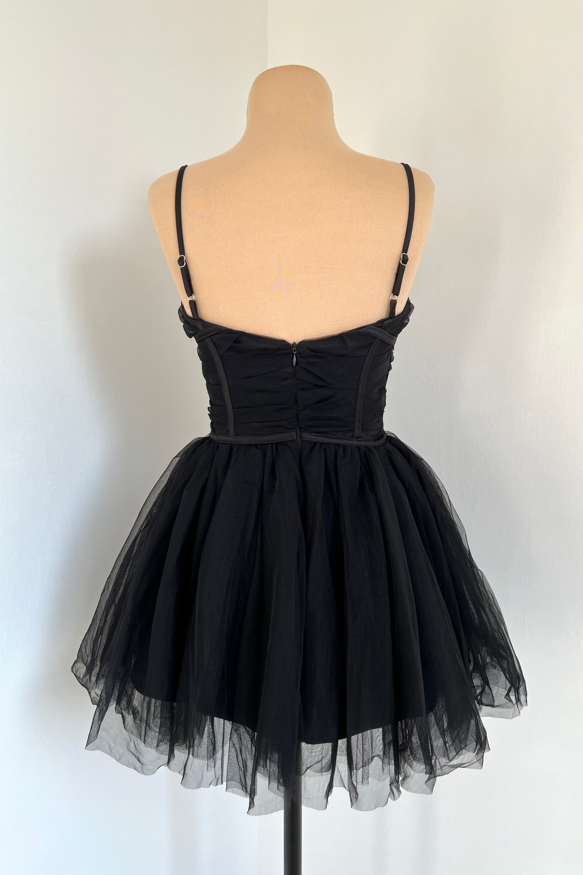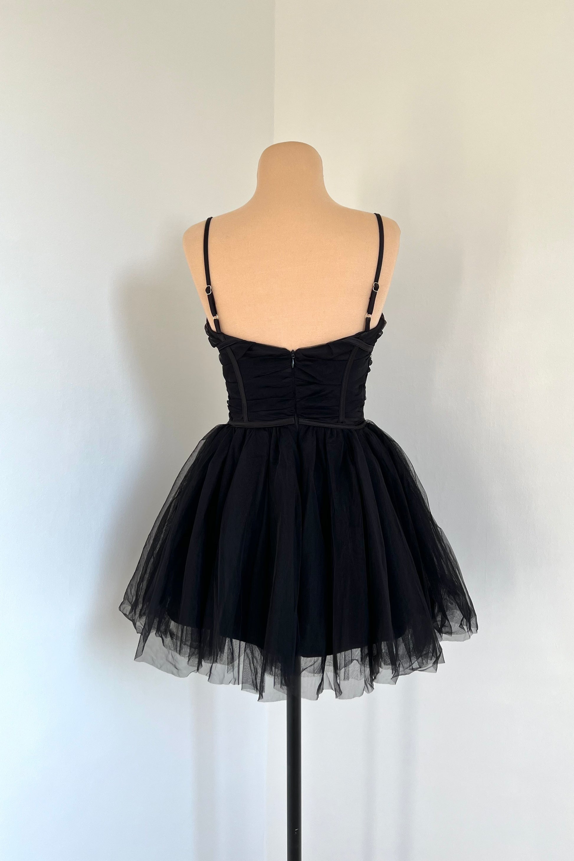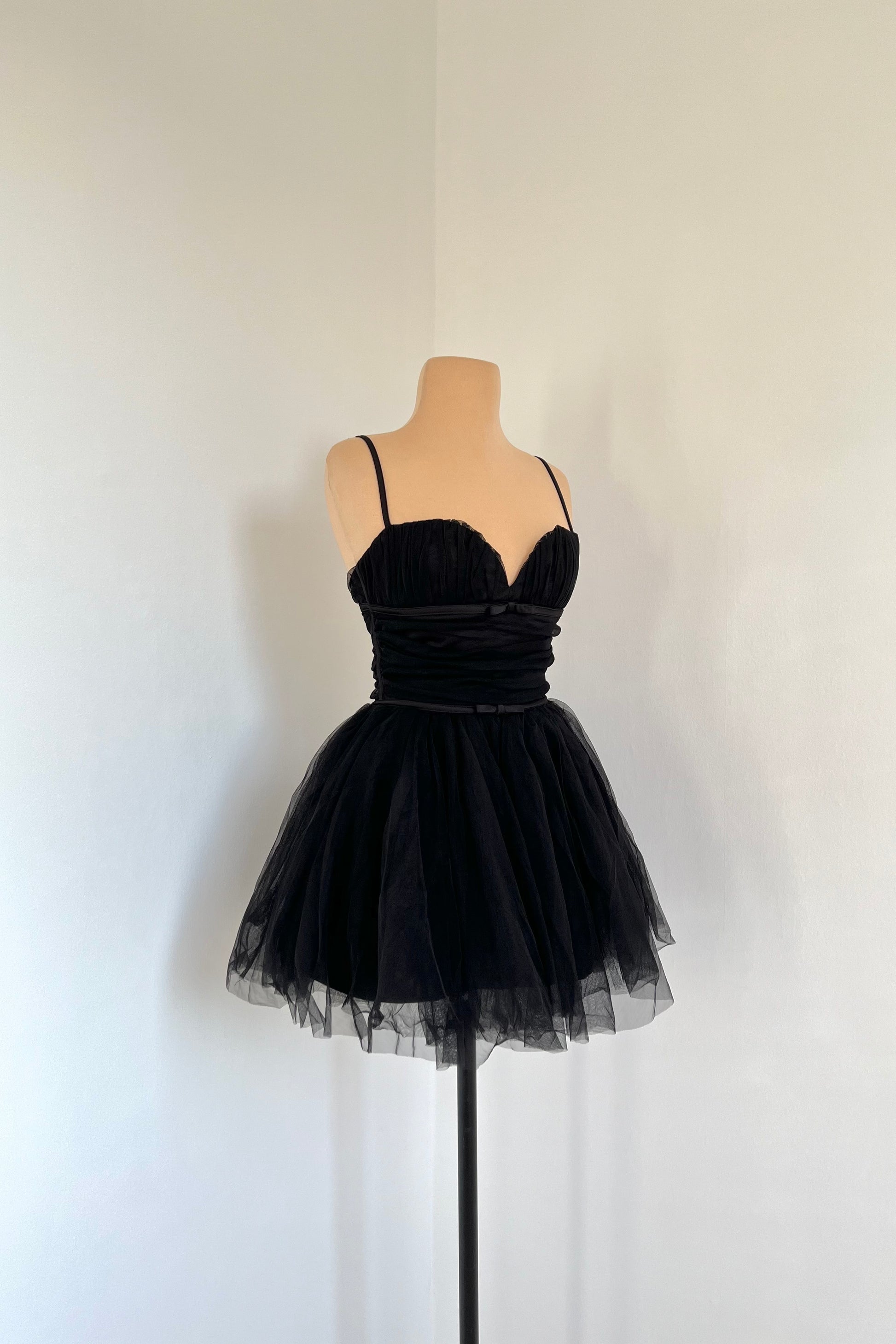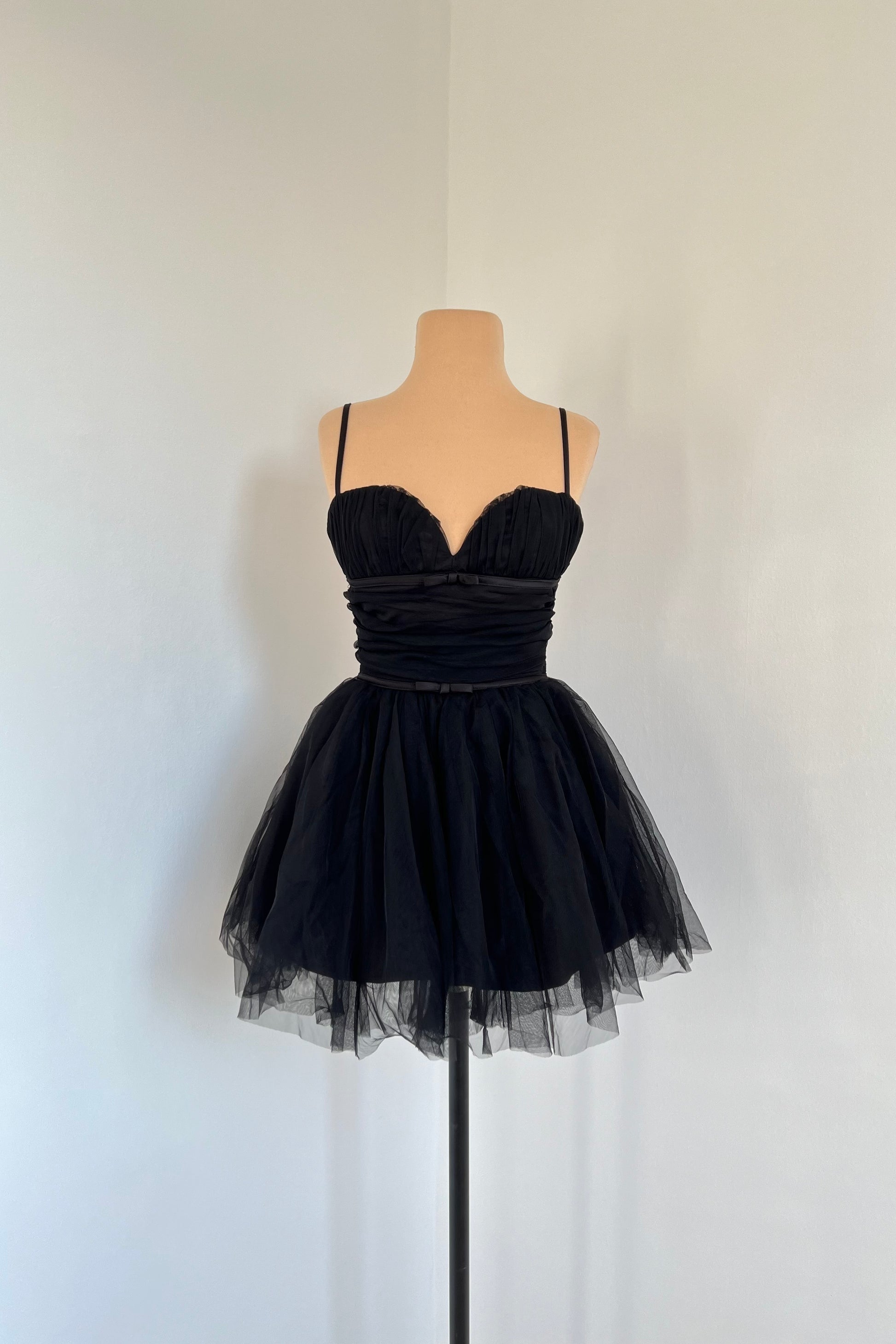 Short tulle dress with plunging neckline, bow details and adjustable straps.