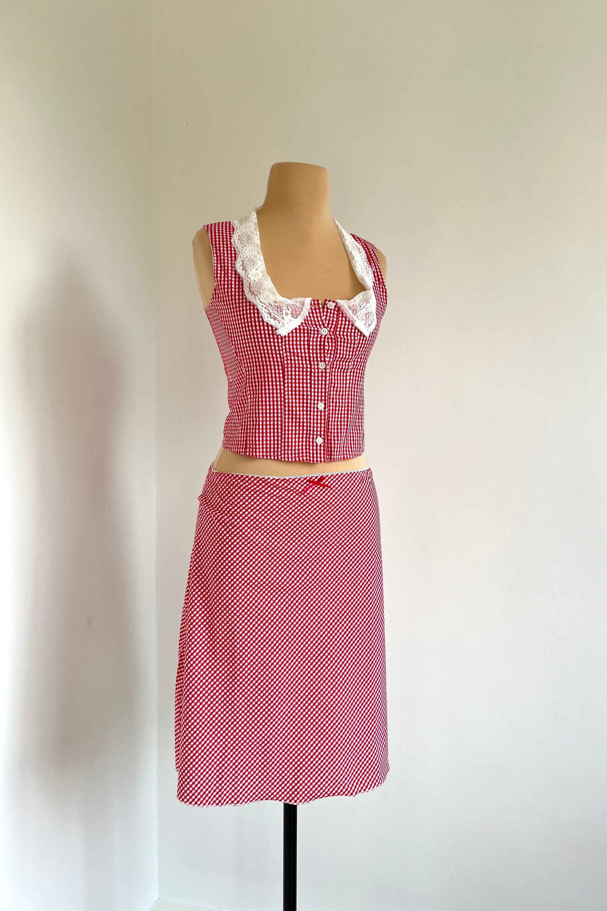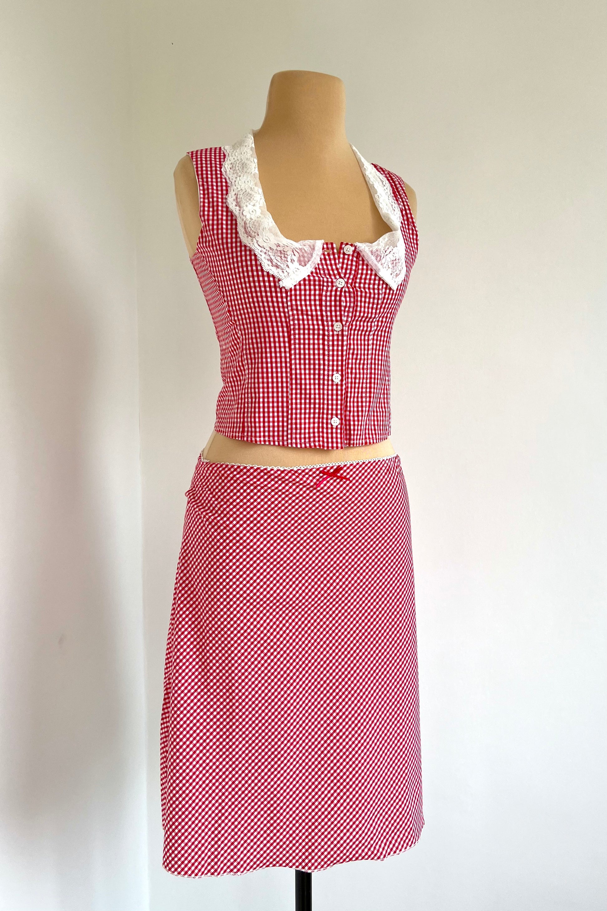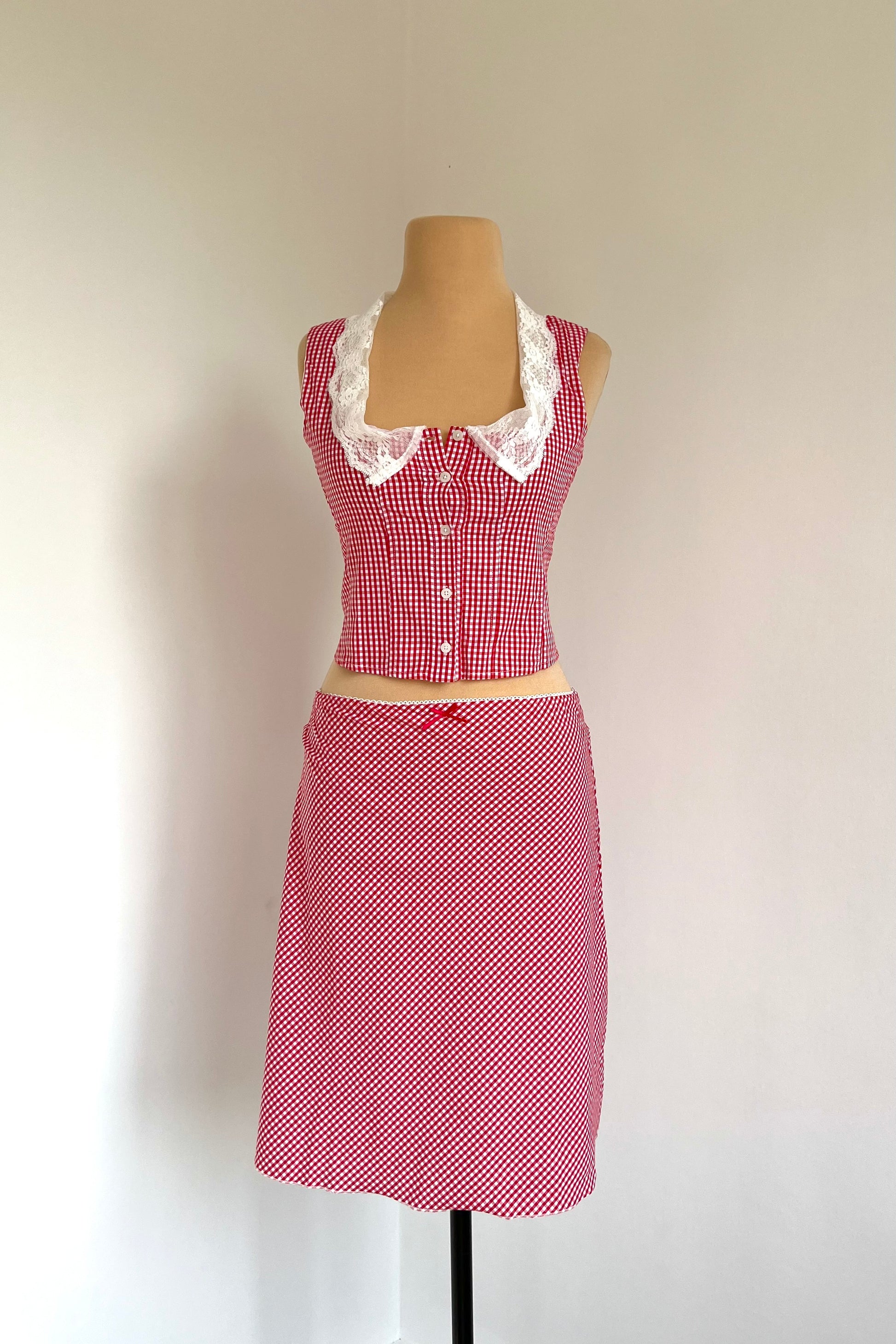 Two piece set of a button-up top and a midi skirt with a bow detail.