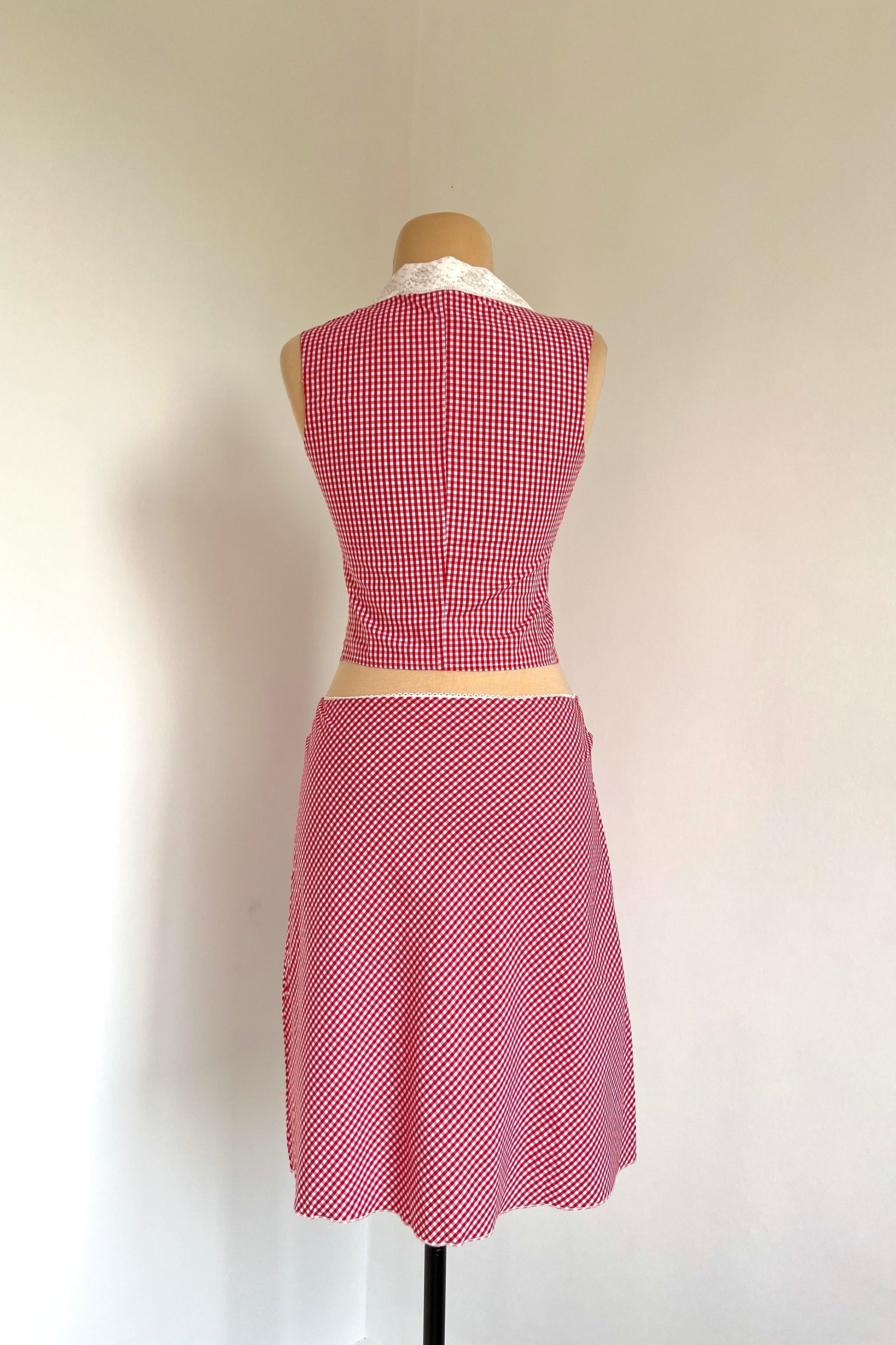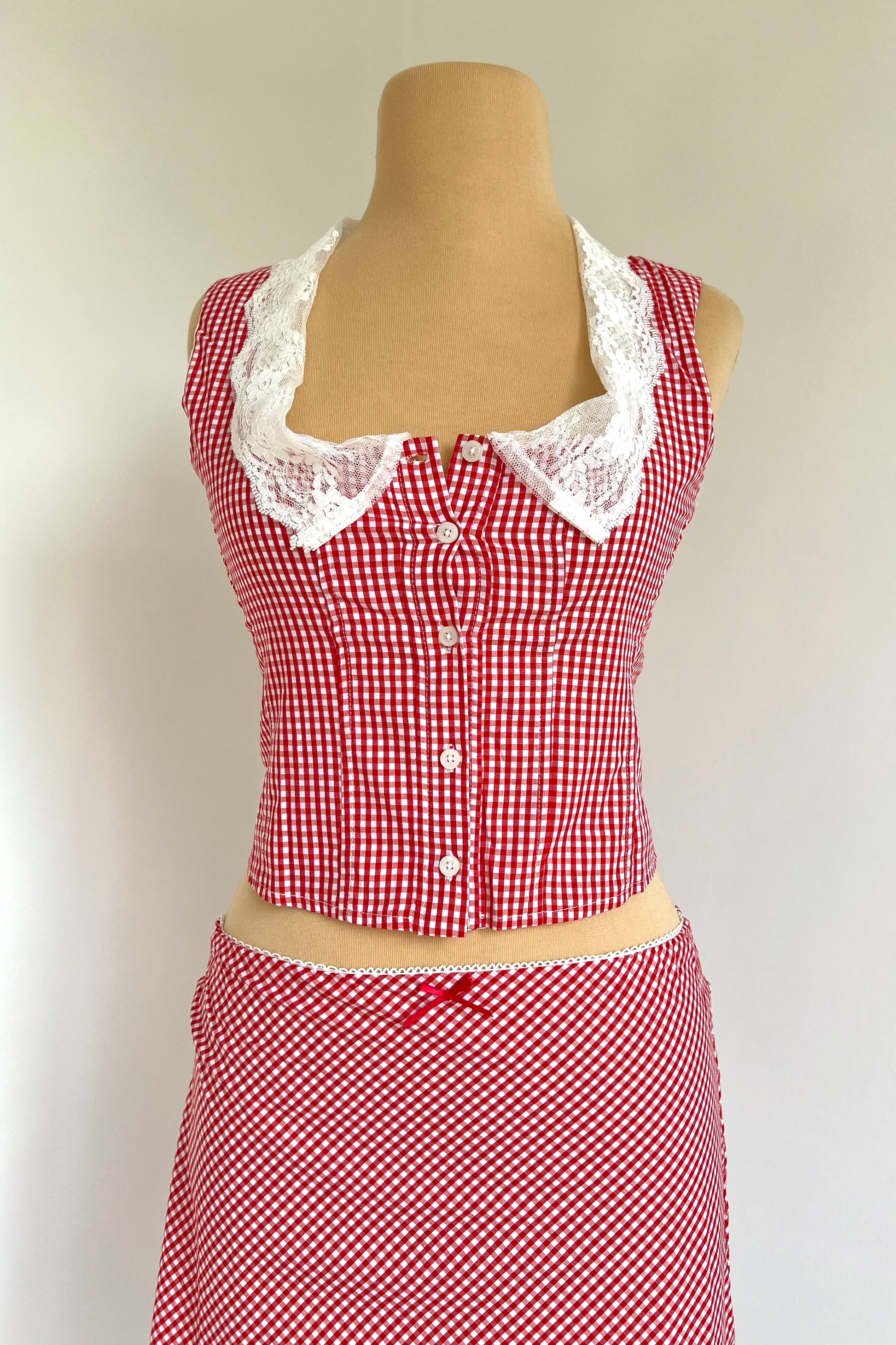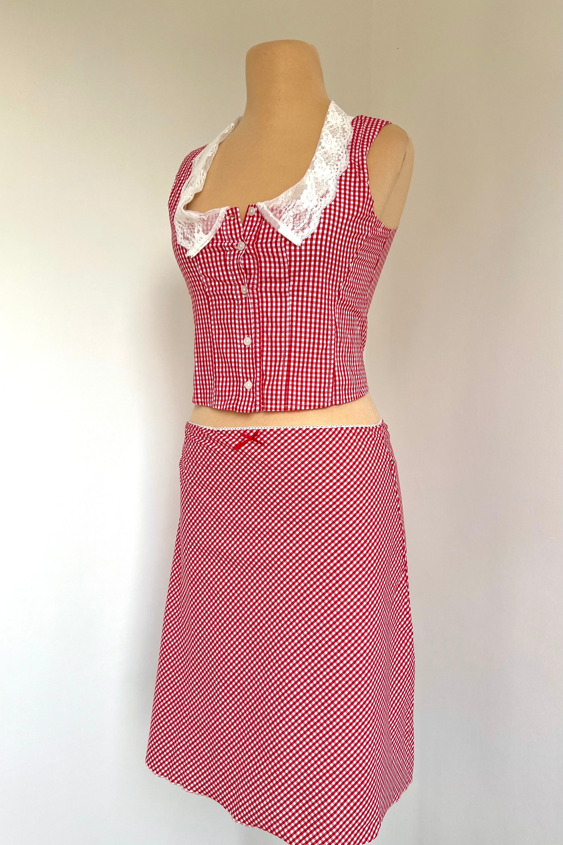 Two piece set of a button-up top and a midi skirt with a bow detail.