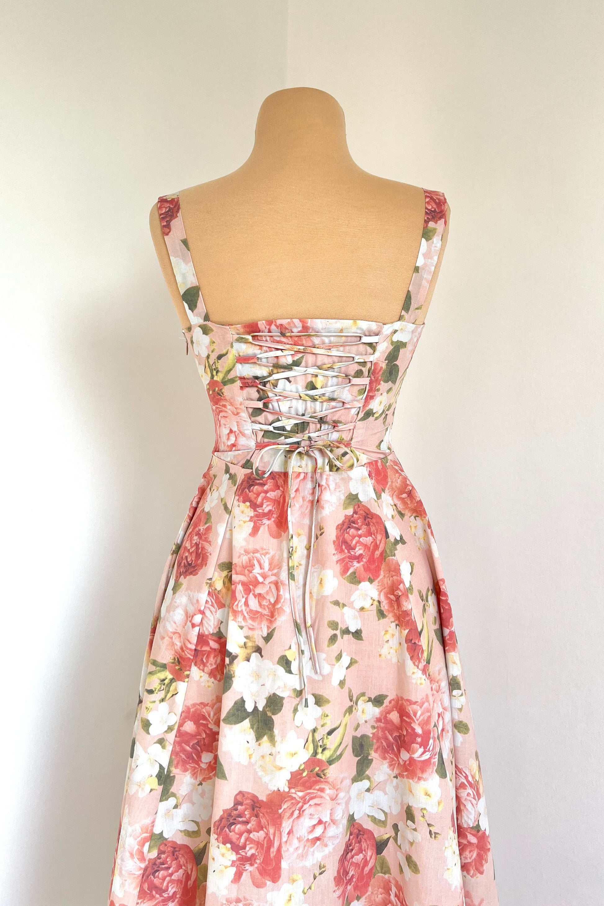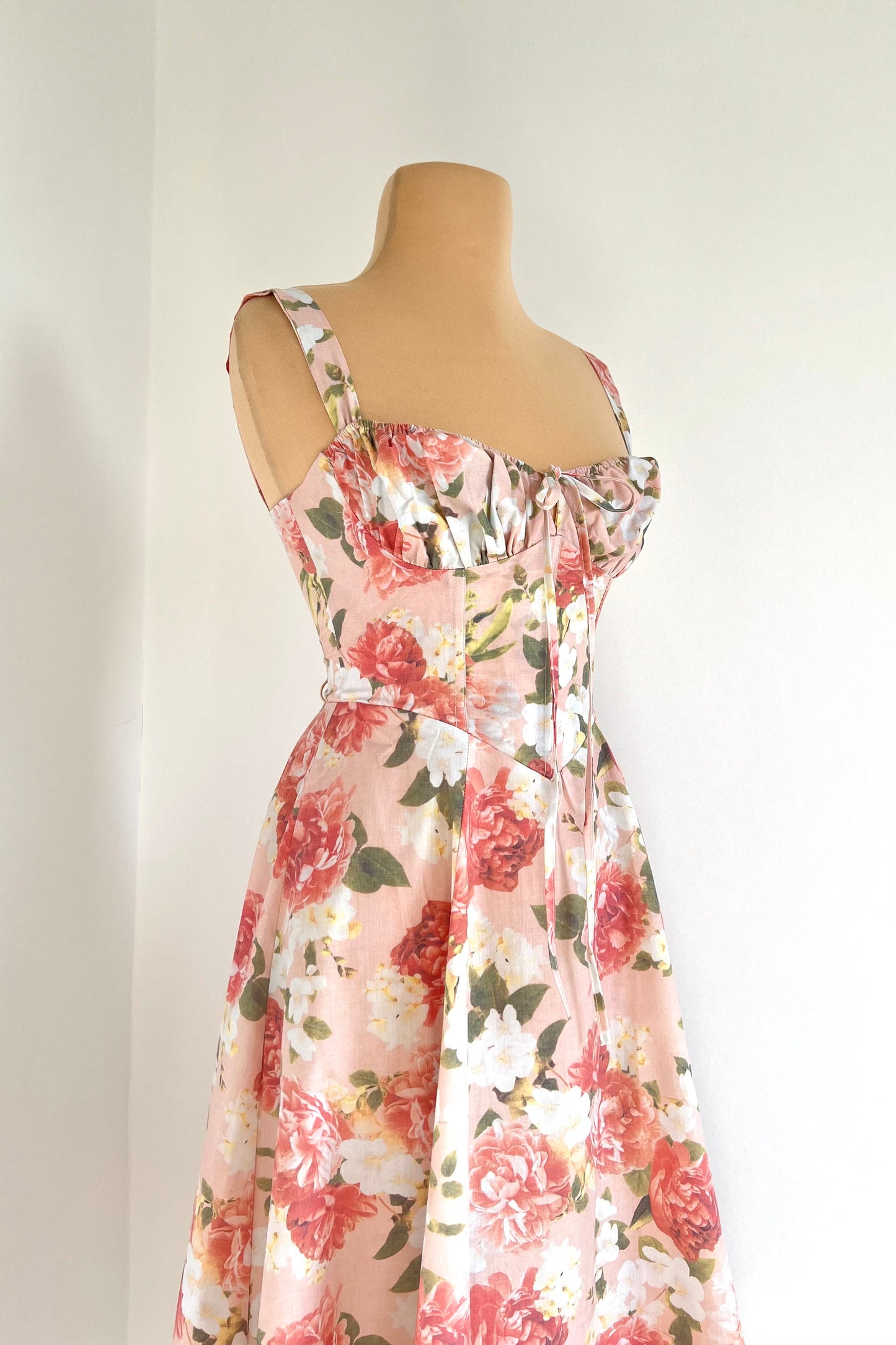 Midi dress with floral print and corset.