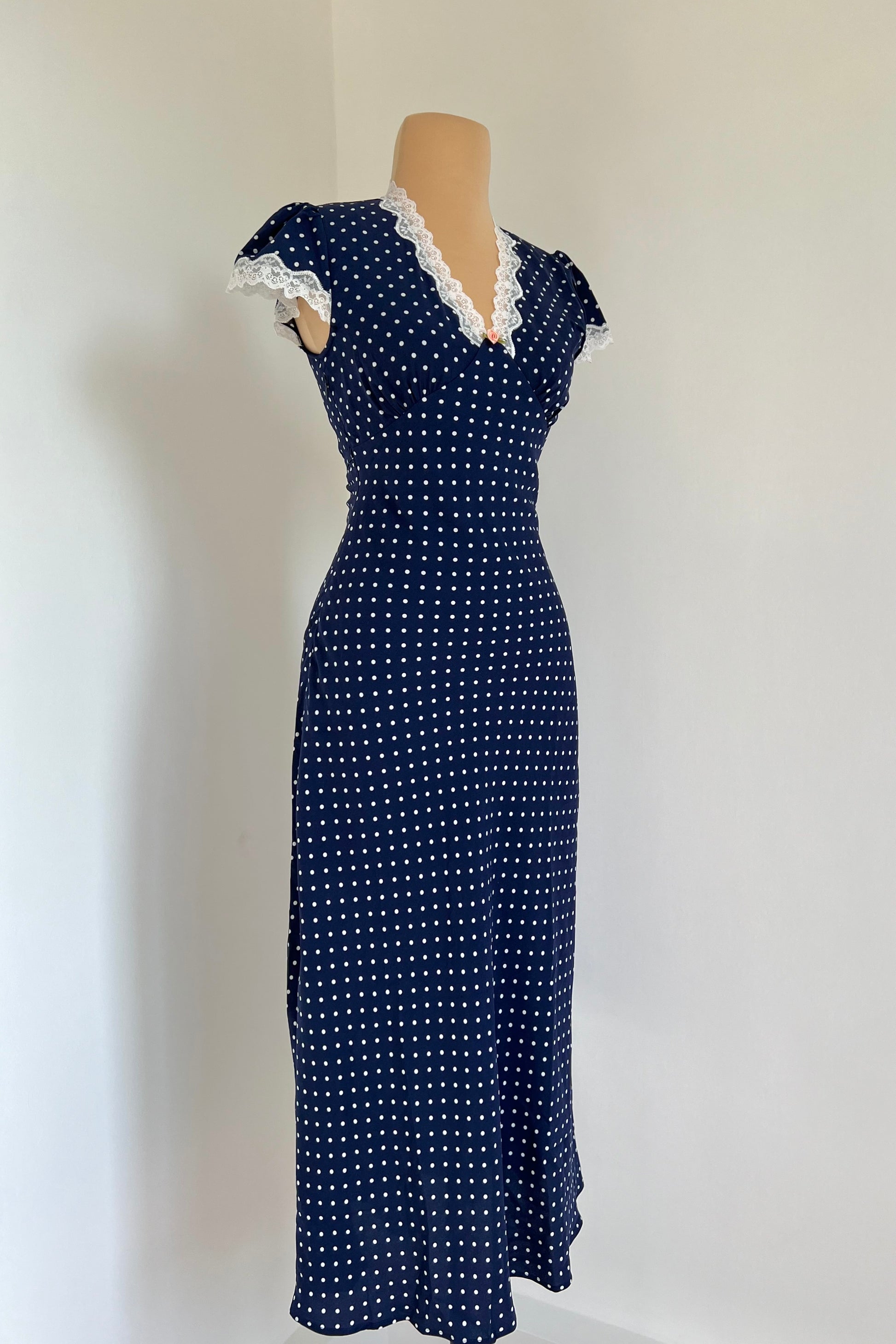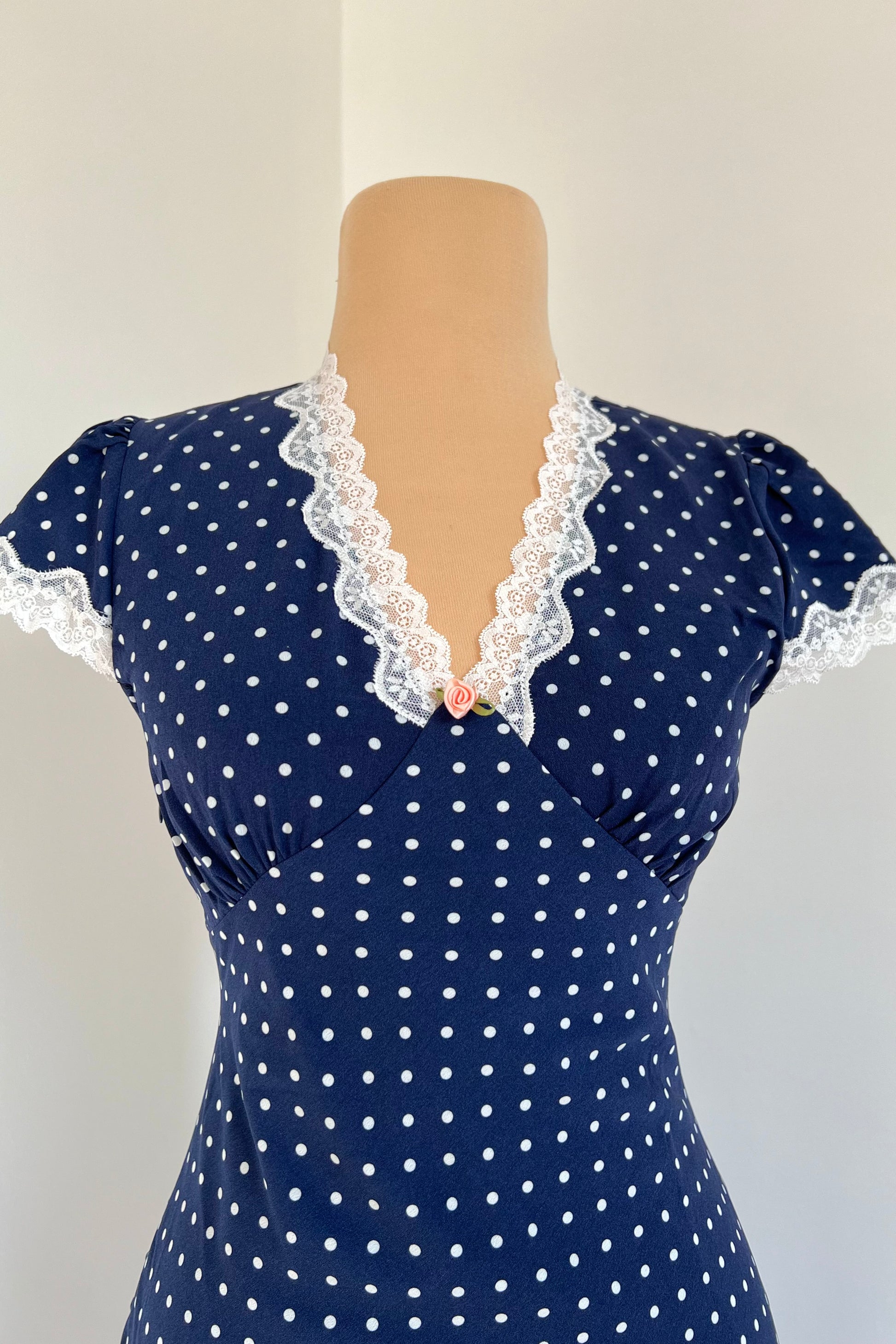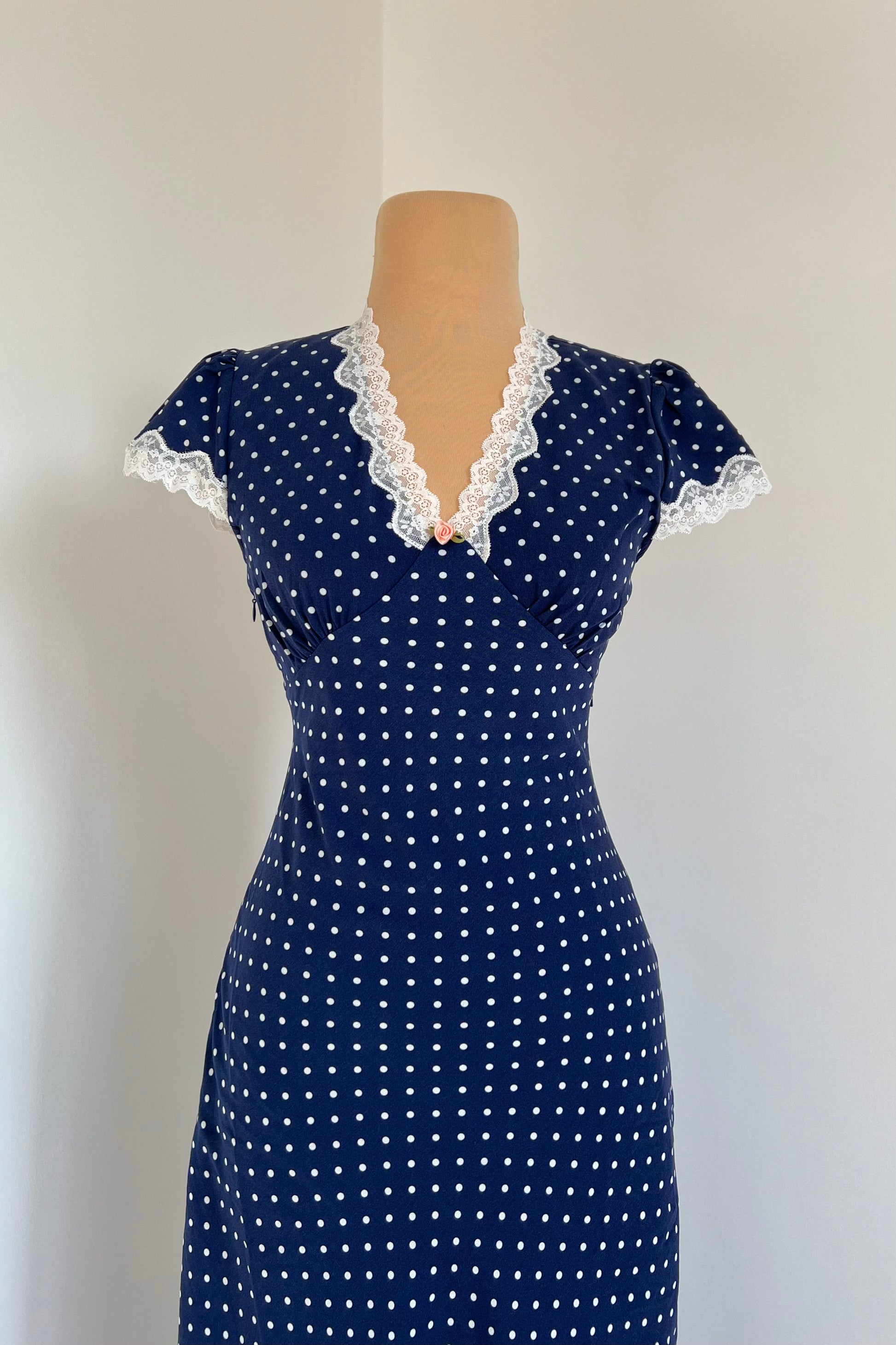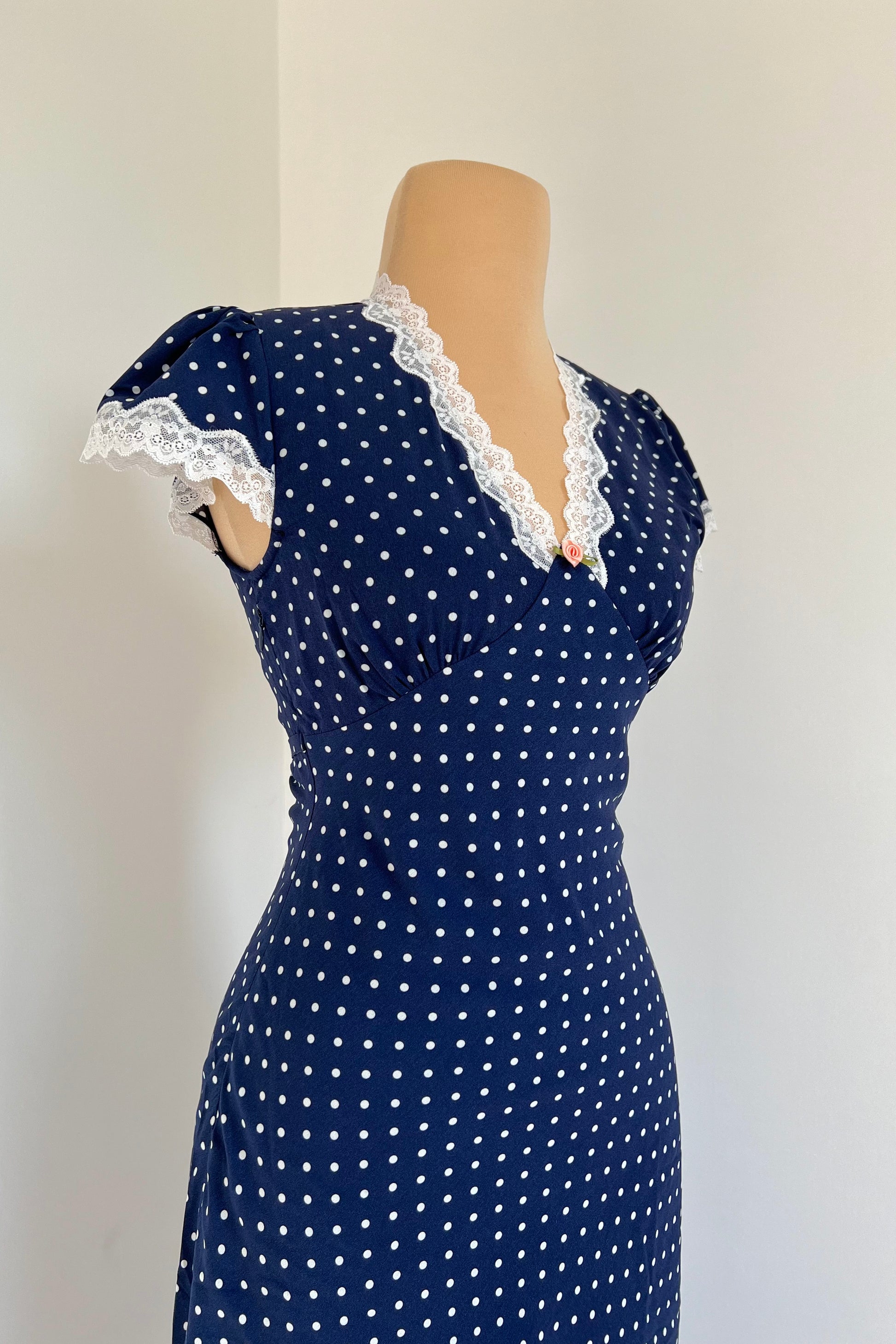 Navy blue maxi dress with polka dot print, rose and lace details.