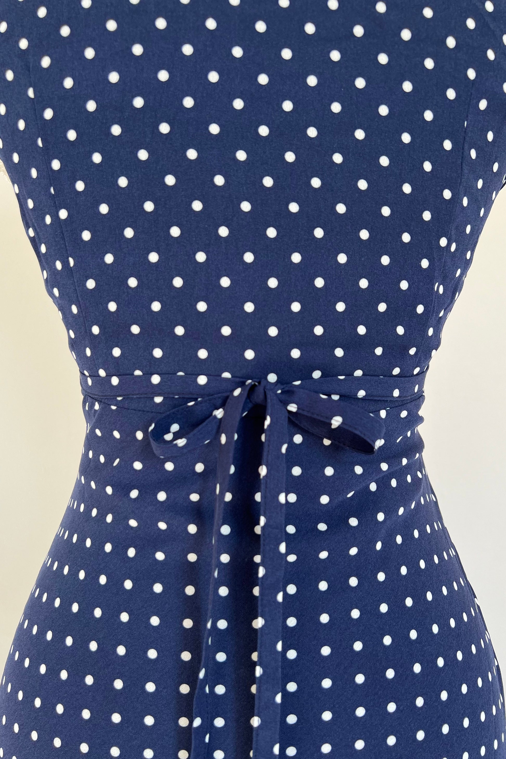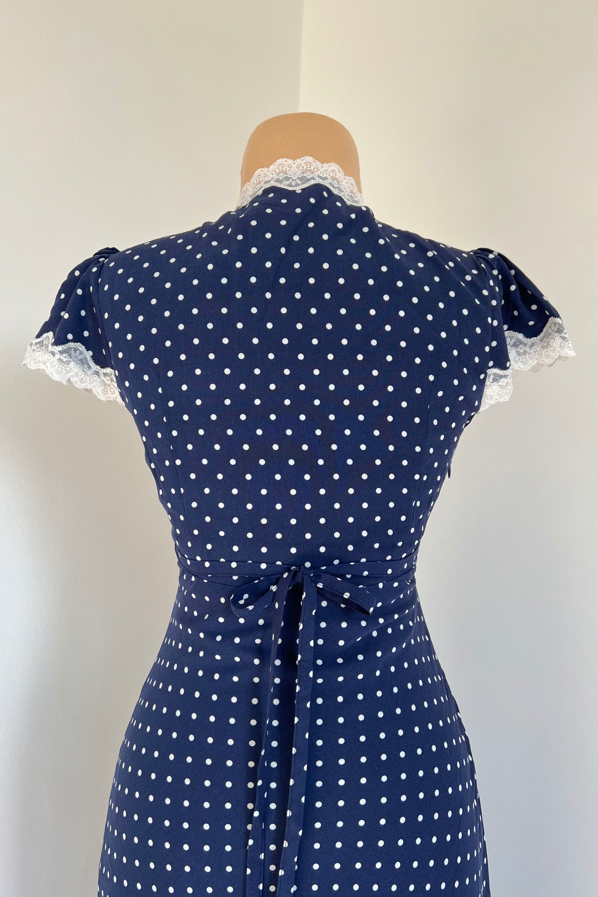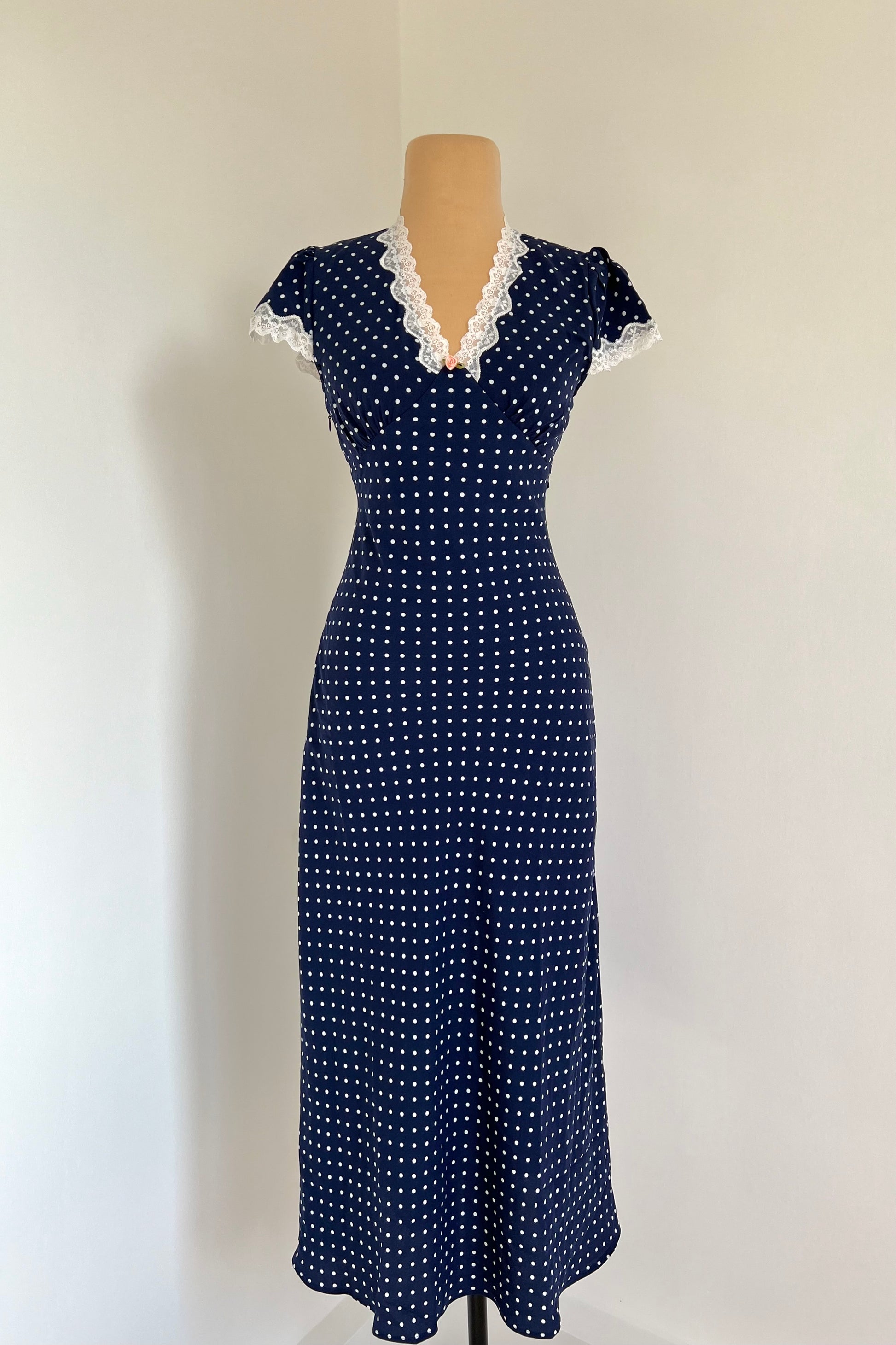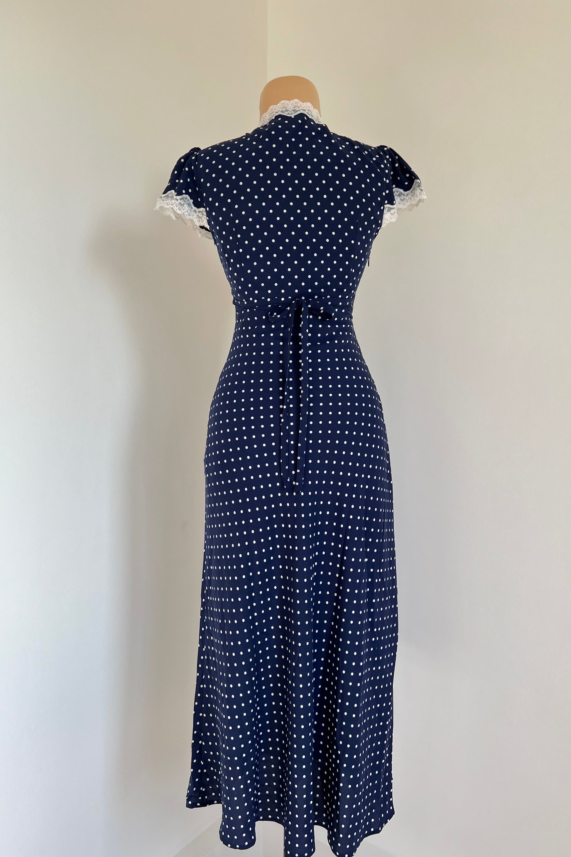 Navy blue maxi dress with polka dot print, rose and lace details.